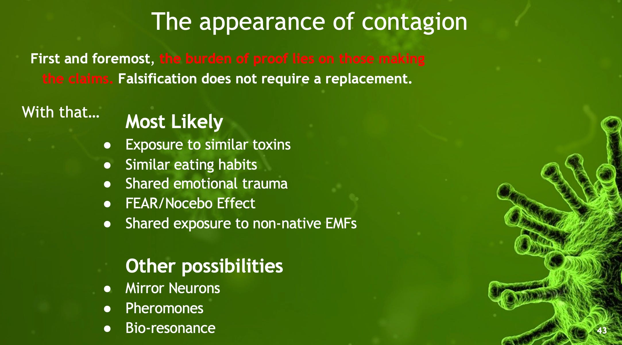My final rebuttal to this point is this: not only does virology not adhere to the scientific method at all, the idea of contagious diseases itself is completely unproven as well. Essentially, every experiment that has attempted to show contagion via natural, reasonable means has shown the opposite. For clarity’s sake, there are studies claiming to prove contagion, but I’d argue that cracking open the skull of a monkey and pouring toxic substances in or injecting the stomach of a lab-rat outside of its natural environment are not natural, reasonable means. We discuss this point thoroughly in our presentation about 90 minutes in.